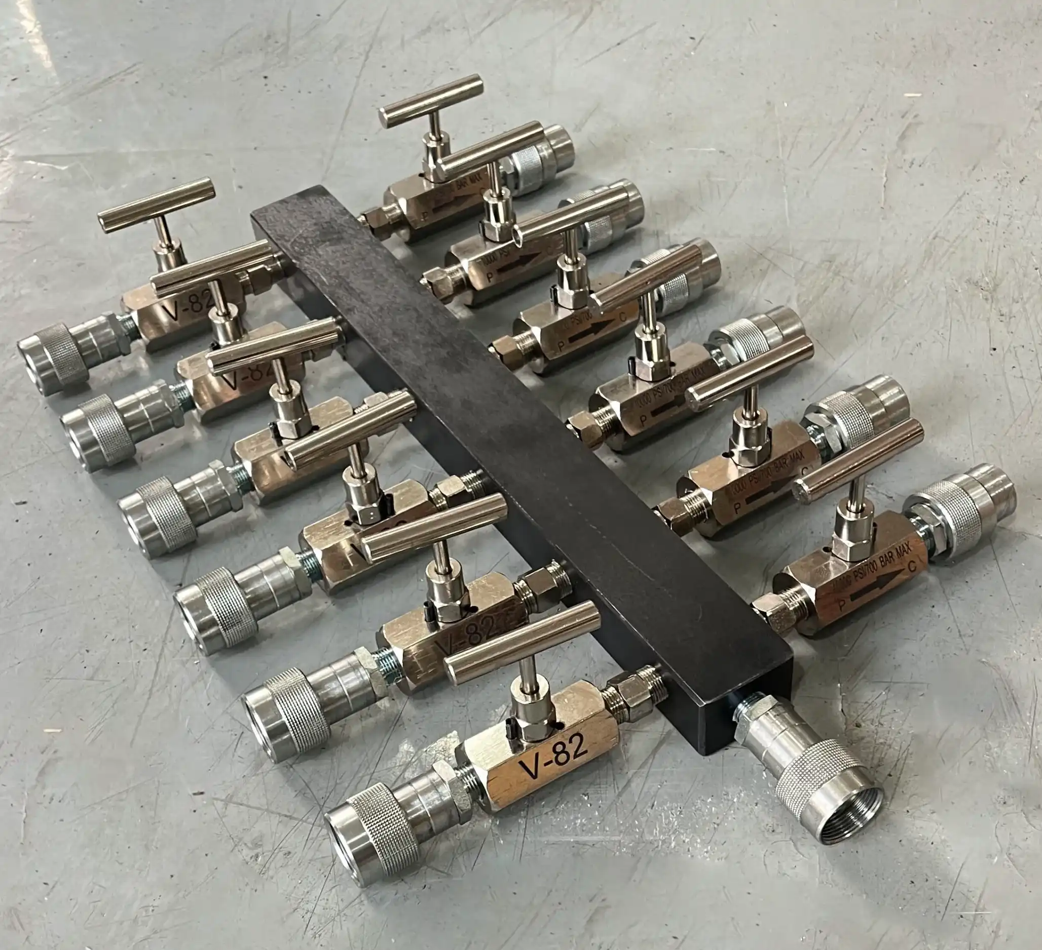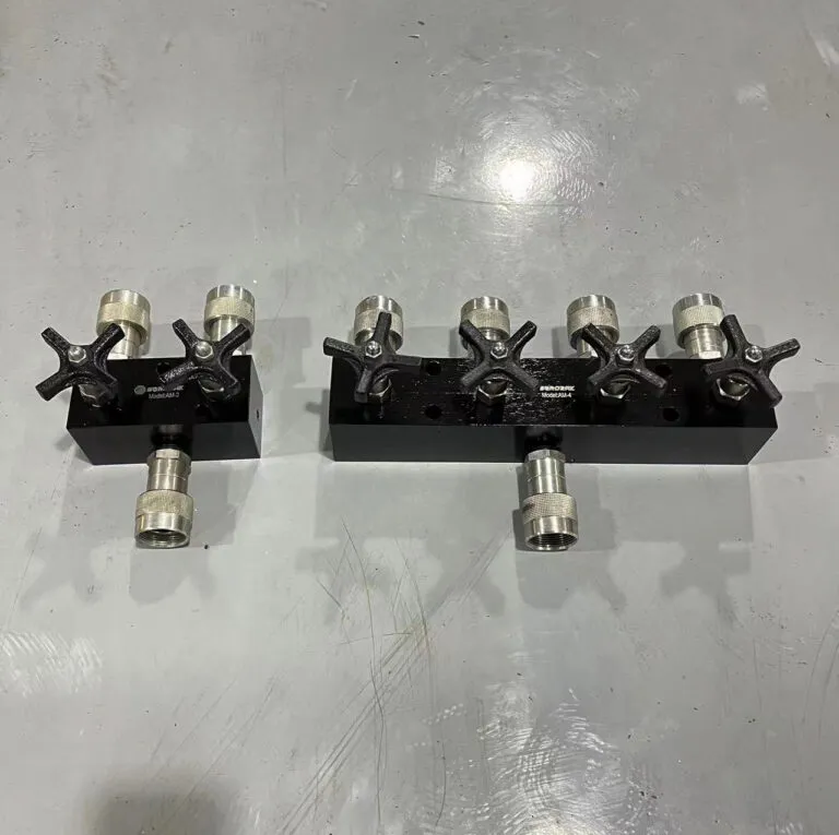AM系列液压分配器可将单入口端口的流量分流至2个或4个出口端口。每个端口配有集成针阀手柄,用于开启或关闭流量。 所有端口接口均为3/8″-18 NPTF规格,两种型号的最大工作压力均可达10,000 psi(700 bar)。 AM21型号配备2个出口 AM41型号配备4个出口