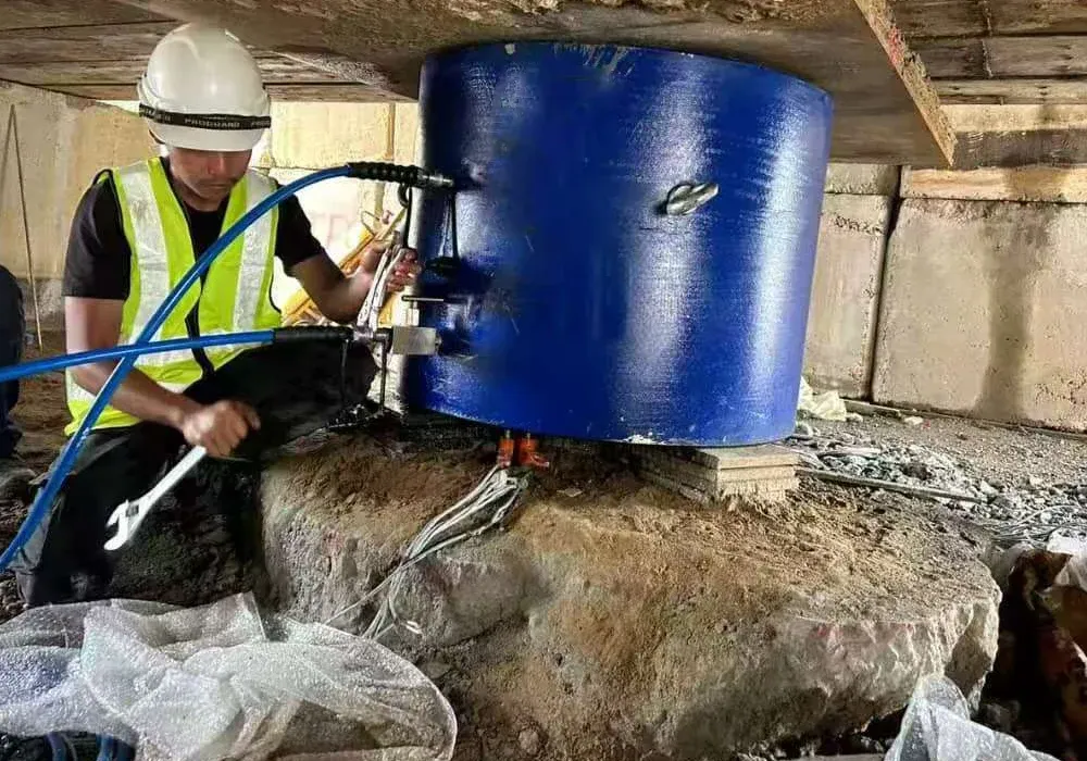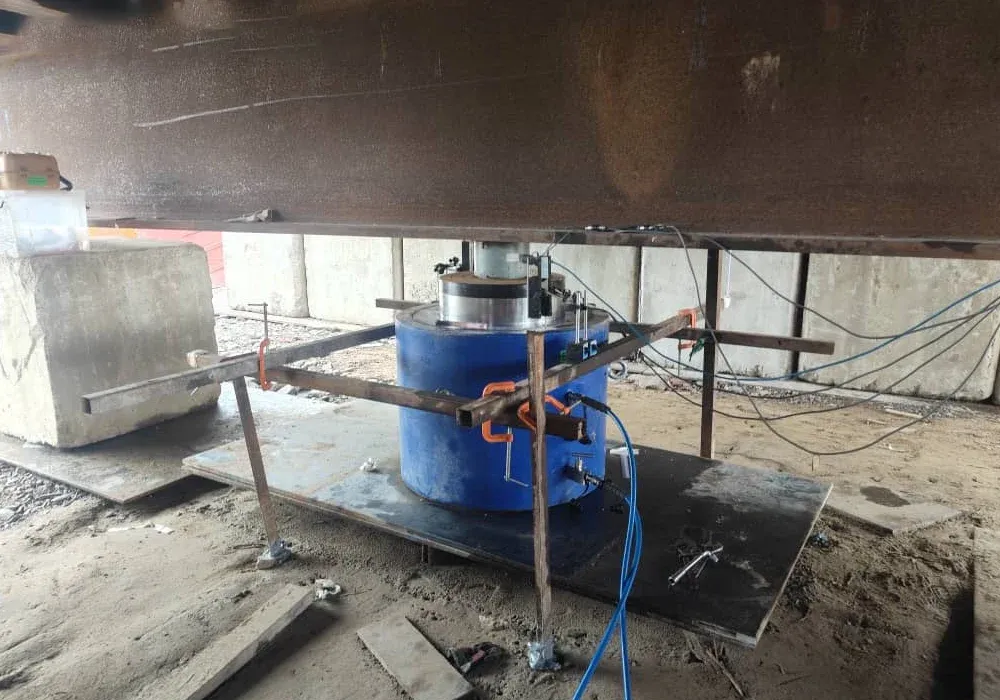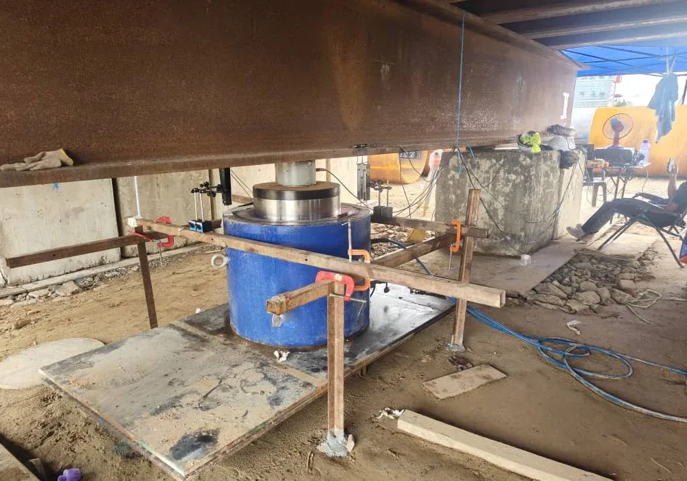 6. 液压千斤顶顶住桩头和格架主梁下侧。液压千斤顶逐渐膨胀,导致从静载格架到桩头的负载逐渐增加。